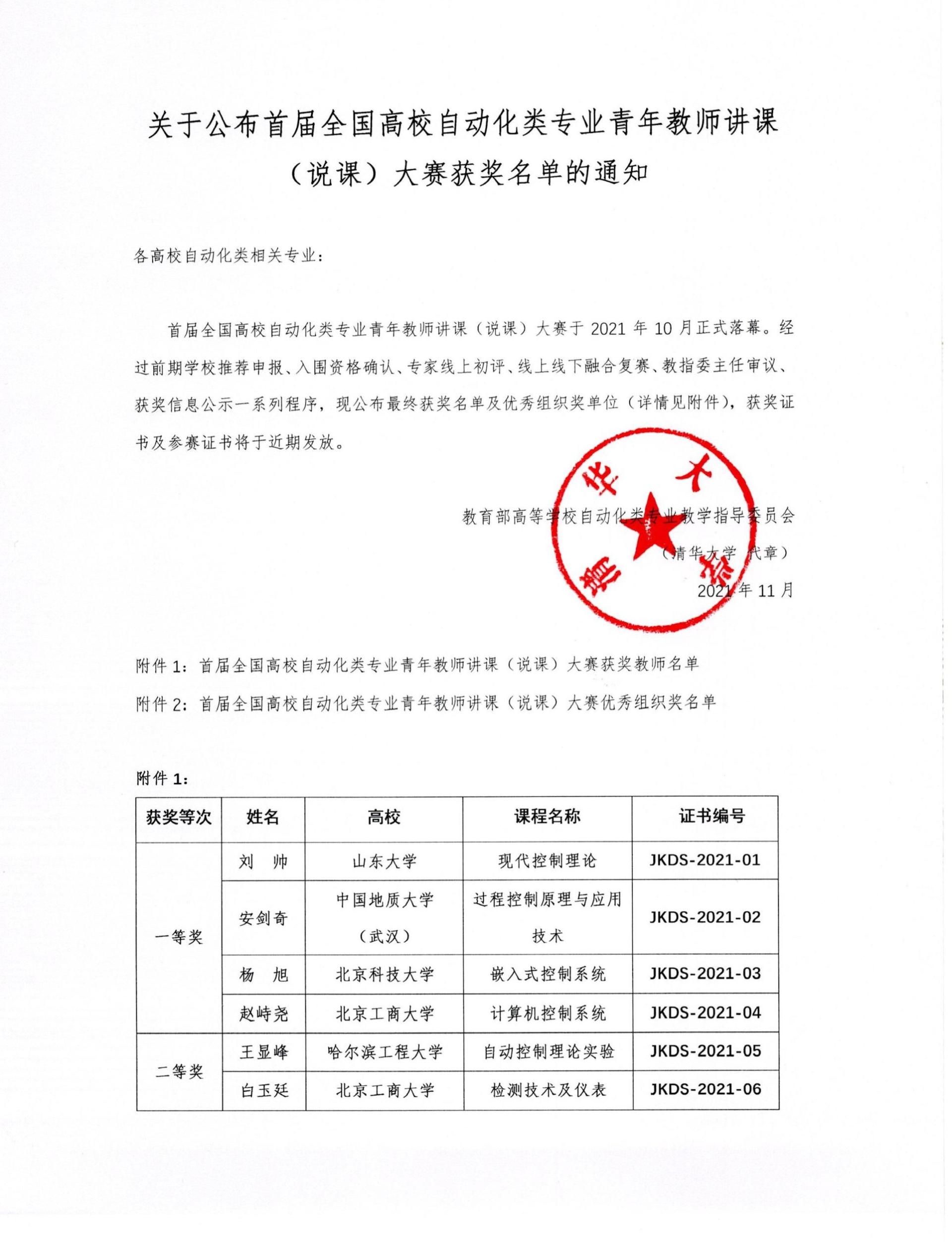 本届比赛受到全国自动化类专业教师的广泛关注和积极参与,共有来自86所高校的116名教师参加。前后历时半年,通过学校推荐申报、入围资格确认、专家线上初评、线上线下融合复赛、教指委主任审议、获奖信息公示等一系列程序,最终决出一等奖4名,二等奖11名,三等奖20名。安剑奇教授以过硬的教学能力脱颖而出,在全国教学交流与竞赛平台上展现了91探花