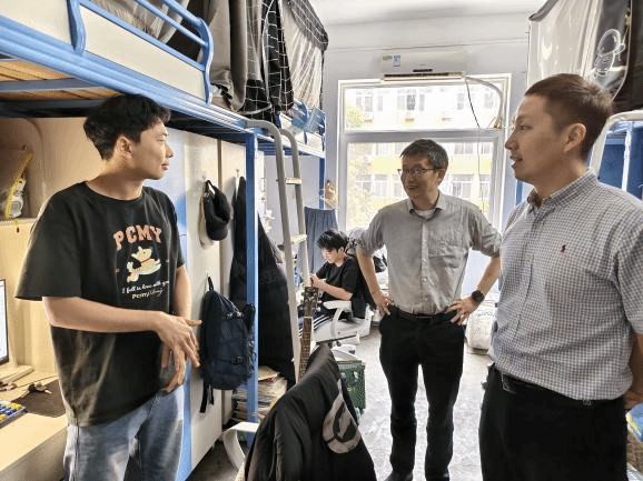 院长曹卫华、副院长陈略峰、党委副书记王向东来到学生宿舍,来到同学们身边,了解同学们的学习生活情况,针对同学们学业困惑、生活困难和就业规划等成长成才问题给予建议。老师们勉励大家要坚定理想信念,练就过硬本领,将个人发展与国家战略相结合。
