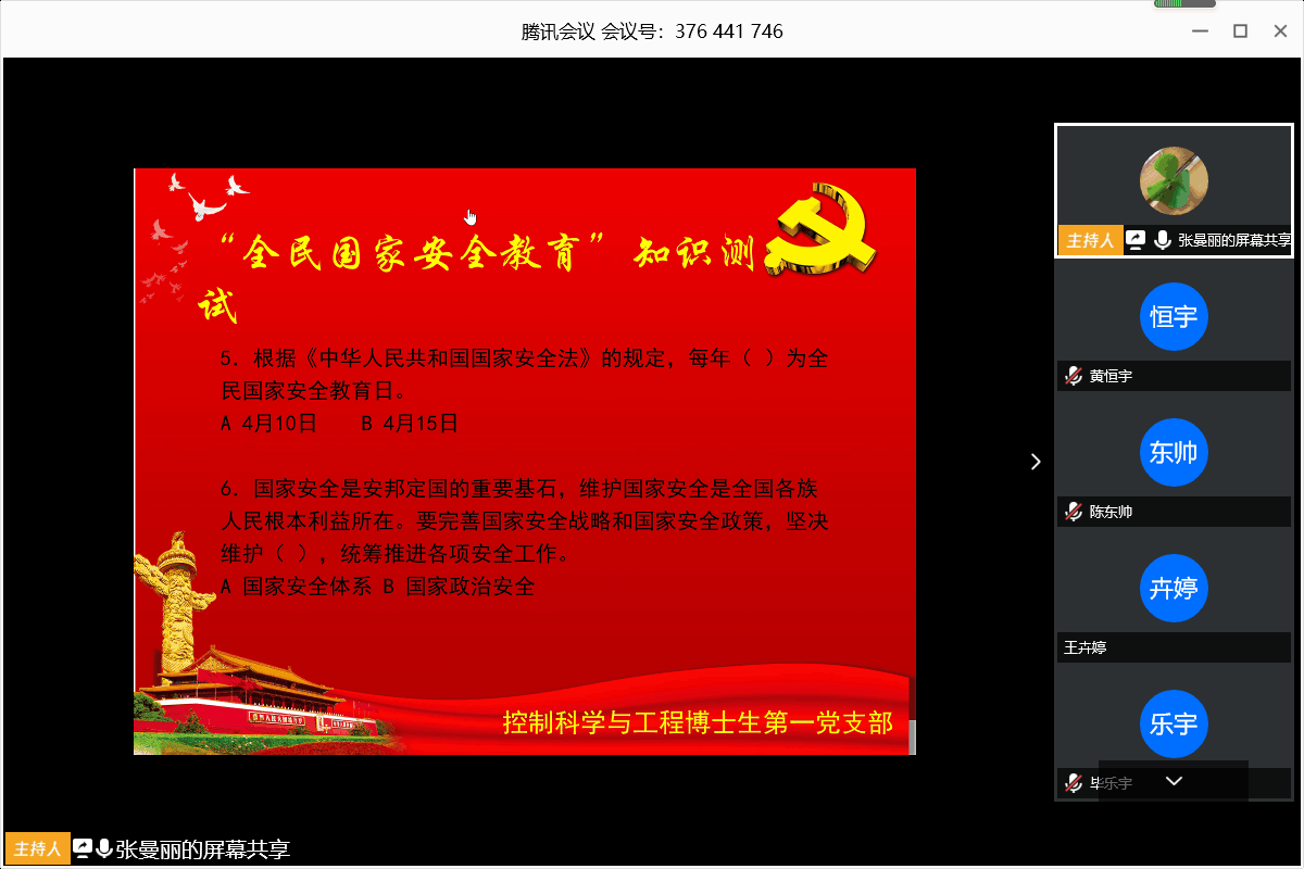 控制科学与工程博士生第一党支部在支部书记张曼丽同志的带领下学习了习近平总书记关于总体国家安全观的系列重要论述,明确了国家安全的概念等相关知识。党支部成员互相交流学习感想,引导党员牢固树立和认真贯彻总体国家安全观,并开展了“全民国家安全教育”知识测试。随后,就当前疫情防控学习了视频“事关学校疫情防控,钟南山、李兰娟、张文宏三位专家这样讲”,进一步明确了当前疫情防控形势和复学过程中应该注意的问题。最后,杜胜同志分享了自己在加拿大阿尔伯塔发放健康包的志愿活动经历。