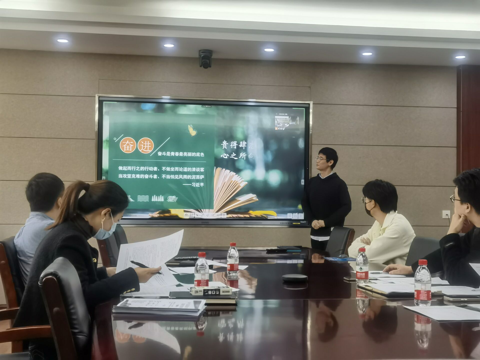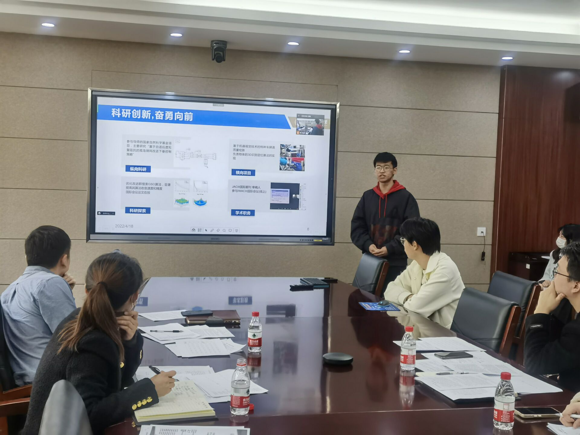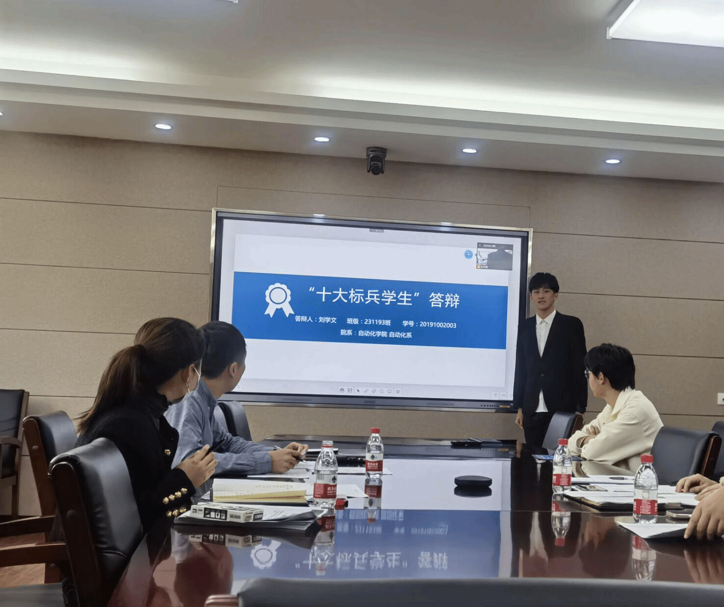 首先进行本科生十大标兵学生的答辩。杨豫龙同学从科研竞赛、学生工作、文体活动、创新创业四个方面进行了介绍;