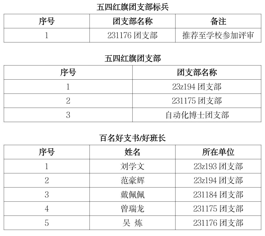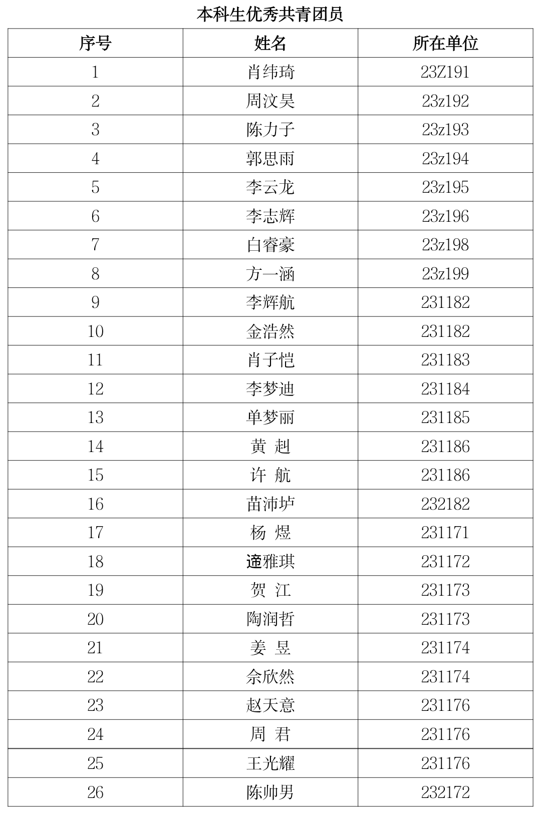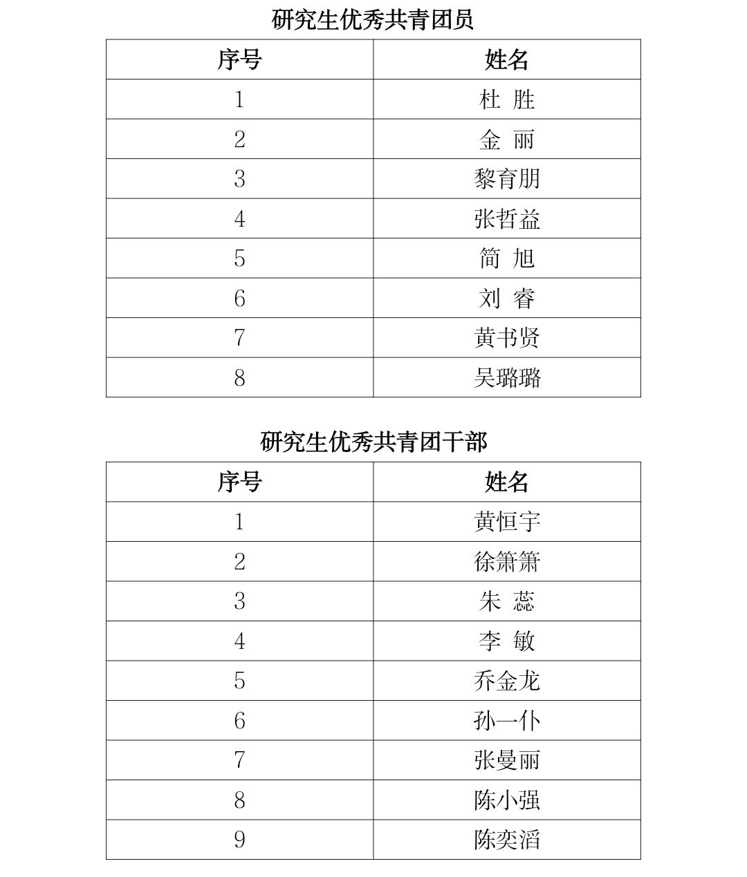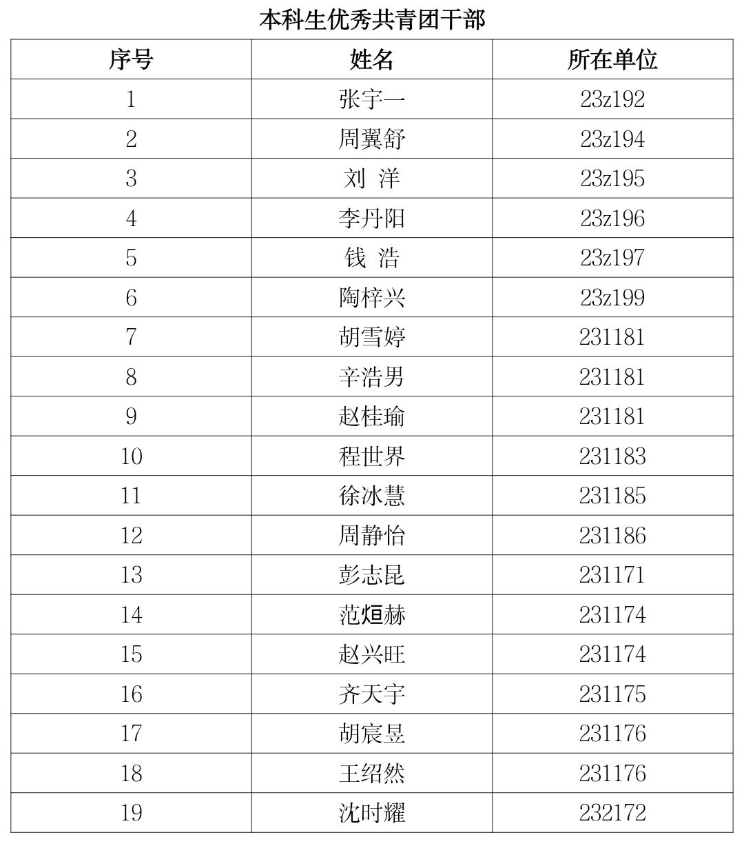 根据学校团委总体要求和学院实际情况,经个人自主申请,学院组织评定,最终评选出本科生优秀共青团干部19人、优秀共青团员26人、百名好班长/好支书共5人、五四红旗团支部2个、五四红旗团支部标兵1个(推荐至学校参加评审);研究生优秀共青团干部9人、优秀共青团员8人、五四红旗团支部1个,现将名单予以公示: