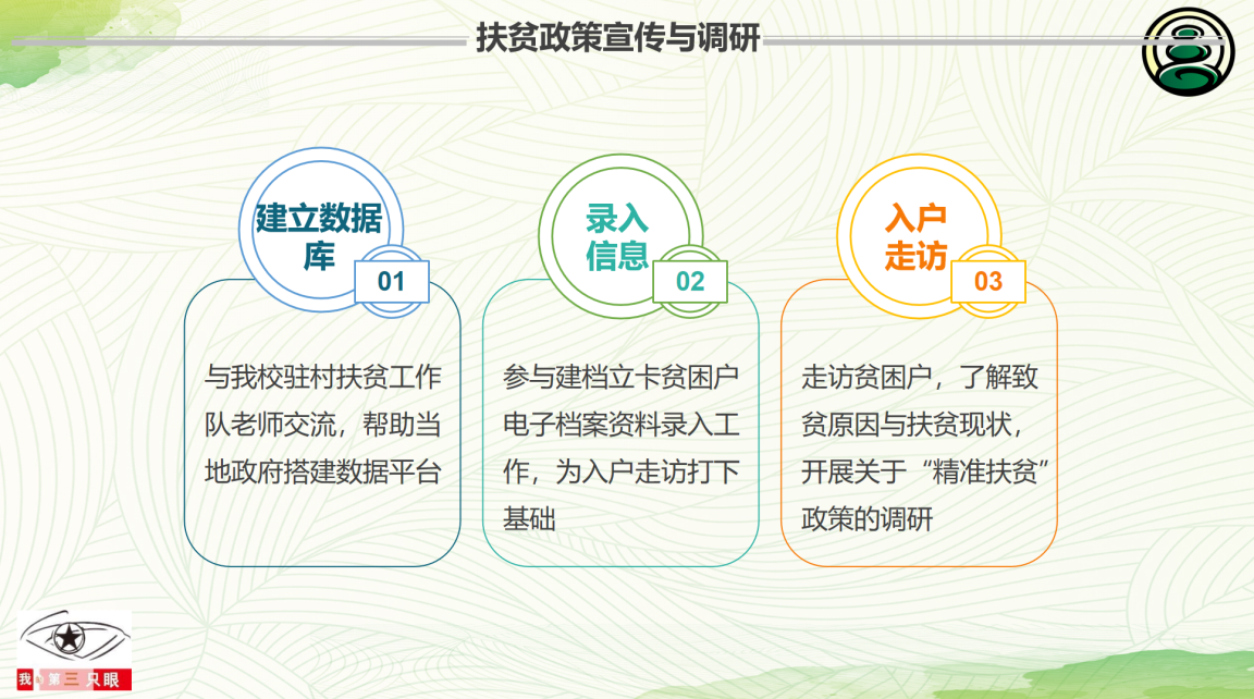 宣讲开始,先是王怡然介绍国家政策背景,两个一百年奋斗目标:第一个一百年,是到中国共产党成立100年时全面建成小康社会;第二个一百年,是到新中国成立100年时建成富强、民主、文明、和谐、美丽的社会主义现代化强国,以及精准扶贫战略、乡村振兴战略。