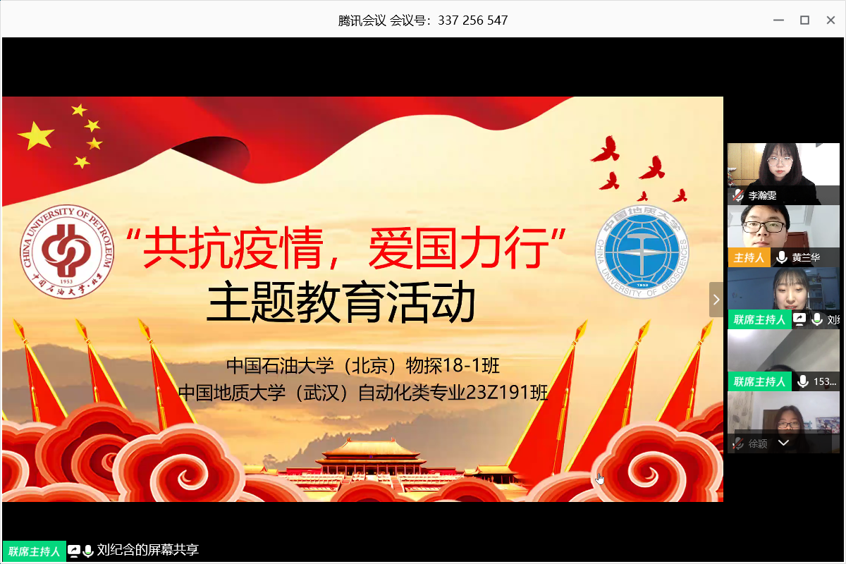 (通讯员:黄兰华、肖纬琦、尤际尧)为贯彻落实教育部部署的“共抗疫情、爱国力行”主题宣传教育活动,切实把共抗疫情斗争作为推进学生思政教育的重要实践和生动教材,321日晚7点,中国地质大学(武汉)自动化类专业23Z191班与中国石油大学(北京)物探18-1牵手,联合开展以“共抗疫情、爱国力行”为主题的线上班会。本次班会邀请的嘉宾有中国石油大学(北京)马克思主义学院曹培强教授,武汉市江岸区公安分局劳动街派出所所长王晖,武汉市蔡甸区蔡甸街正街社区党委副书记龚姣姣。本次班会坚定了青年学生“四个自信”,激励学生在新时代大力弘扬爱国主义精神,为实现中华民族的伟大复兴而不懈奋斗。