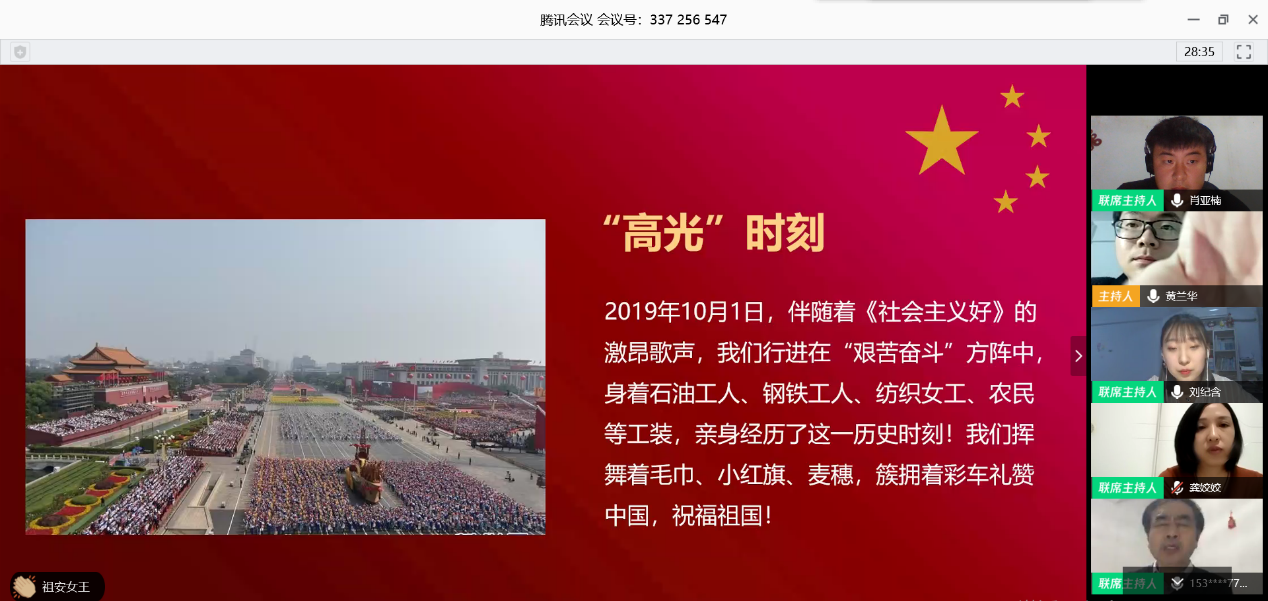 中国石油大学(北京)物探18-1班韩己航同学分享了自己参加庆祝新中国成立70周年群众游行的经历。韩己航同学谈到,同学们在训练中不怕苦、不怕累,对于步幅、步速、排面精益求精,为了确保关键时刻万无一失。在讲到走过天安门广场的经历时,他说:“看见习总书记向我们招手的那一刻,我们的爱国热情一下子就迸发出来了,虽然已经过去半年,现在回想起来,我的内心依然十分激动,参加群众游行是我有生以来最为荣耀的时刻!”“艰苦奋斗”彩车前,他们学习铁人精神,并庄严宣誓“矢志艰苦奋斗,争做新时代追梦人”,他们相信新时代依然是属于奋斗者的时代。