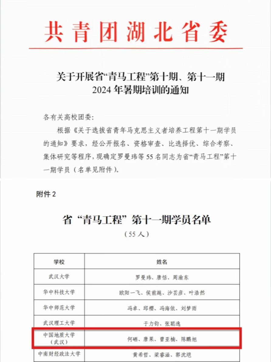 今年5月,共青团湖北省委、湖北省教育厅联合发布《关于选拔省青年马克思主义者培养工程第十一期学员的通知》,从湖北省20所高校中遴选55名大学生作为省“青马工程”第十一期学员。经公开报名、资格审查、比选择优、综合考察、集体研究等程序,91探花