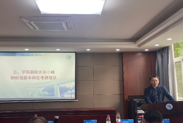 随后,学院副院长陈略峰介绍了学院近年研究生招生政策,通过历年来的详实数据分析了近三年学院毕业生的考研率、升学率和考研分数,指出当前考研的激烈竞争形势,并分享了自身读研深造经历和感悟,建议同学们要充分了解研究生学习生涯状况并做好心理选择、专业知识、实习实践等方面的准备,无论将来是择业就业还是升学深造都要夯实基础,谋划未来。