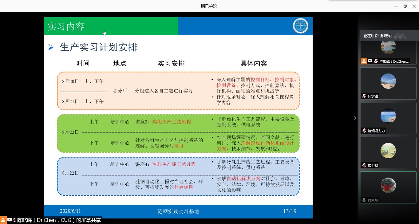 本次会议的主题是涟钢生产实习实施方案讨论。首先陈略峰介绍了涟钢生产实习的实施方案,然后肖朝晖介绍了涟钢培训中心的基本情况。会议对涟钢生产实习实施方案的实习内容、分组安排、安全保障等方面进行了讨论和分析。与会者就如何准备涟钢生产实习提出了意见和建议。