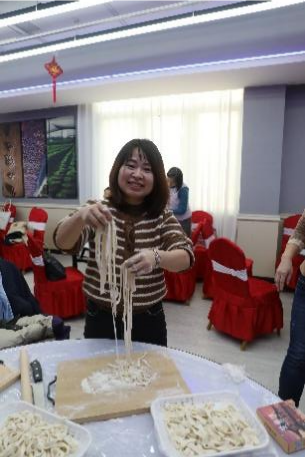 川田誠一教授也被现场快乐的氛围感染,参与其中,体验中国的传统文化,也使活动增添了跨文化交流的色彩。本次活动,受到女教职工欢迎,也得到学院领导的重视。部分女教职工和领导在完成下午的“预答辩”后赶来参加活动。在谈笑风生中,一盘盘热腾腾的饺子端上了桌子,大家共同分享劳动成果。