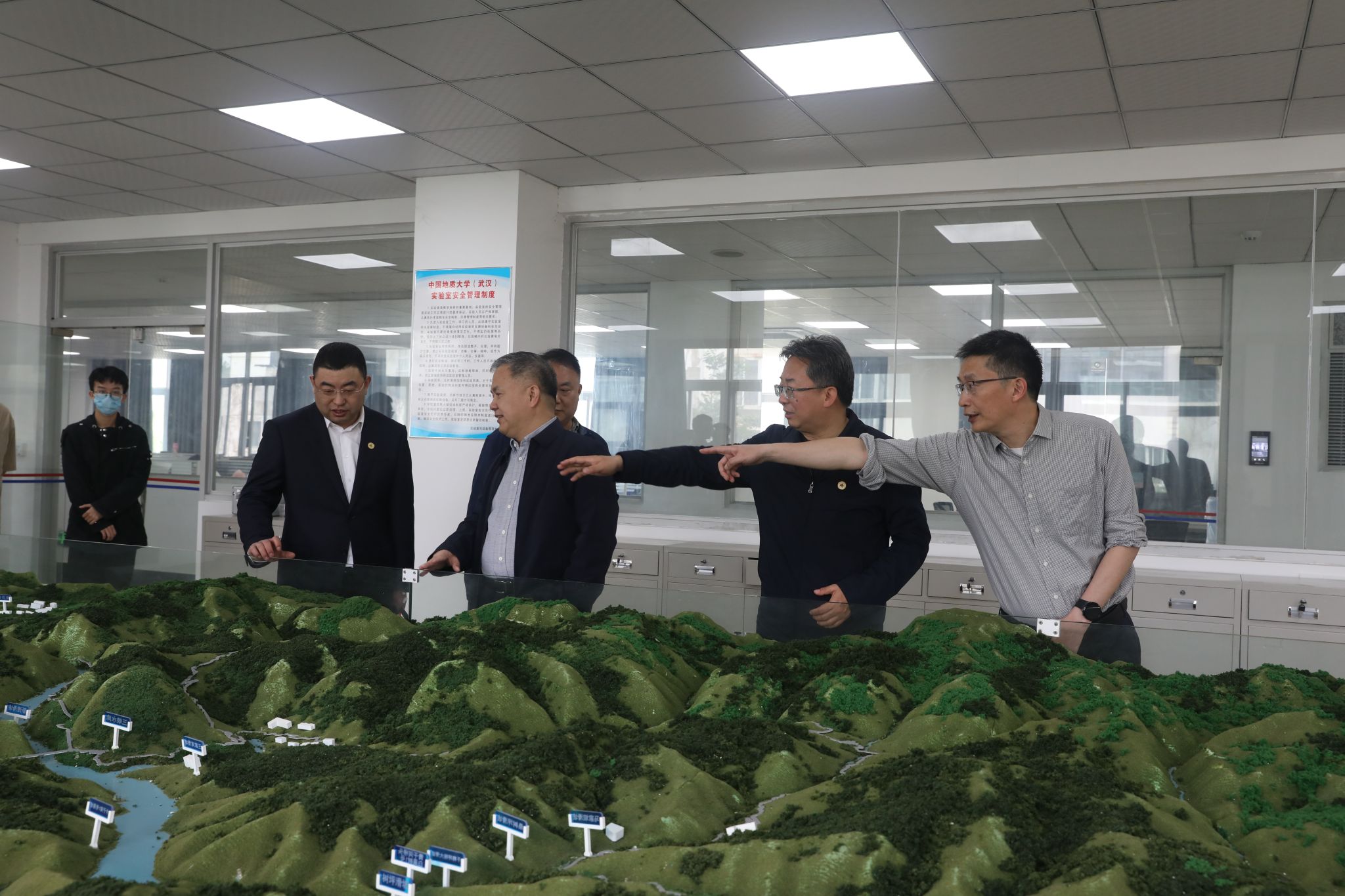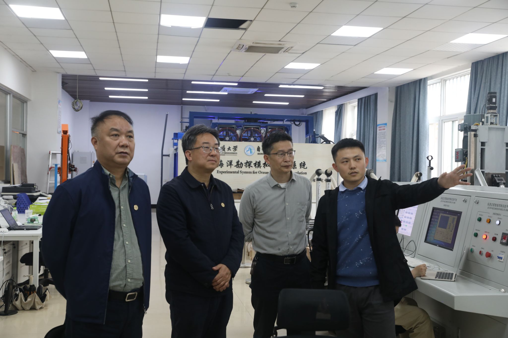 曹卫华院长带领王文军局长一行参观了学院科研实验室,介绍了地质钻探、海洋资源勘探、智能机器人等领域的研究成果和科研平台。
