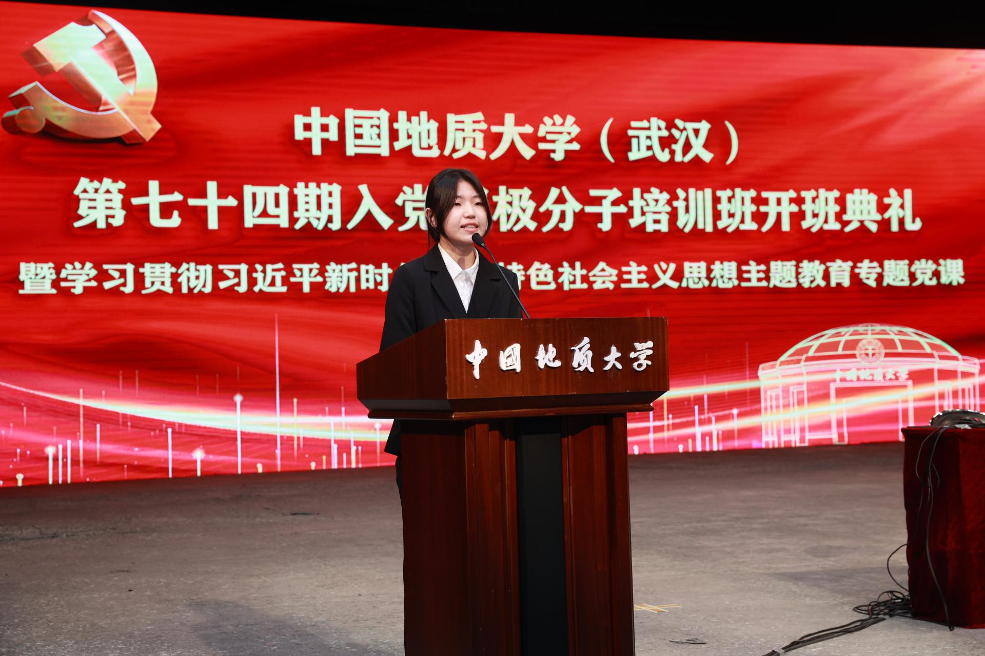 2021级本科生万宇溪作为第七十三期入党积极分子培训班优秀学员代表发言,在党旗下许下对党的庄严宣誓,表达了矢志不移听党话、跟党走的坚定信念,号召参训学员珍惜学习机会,加强思想淬炼,以实际行动向党组织靠拢。