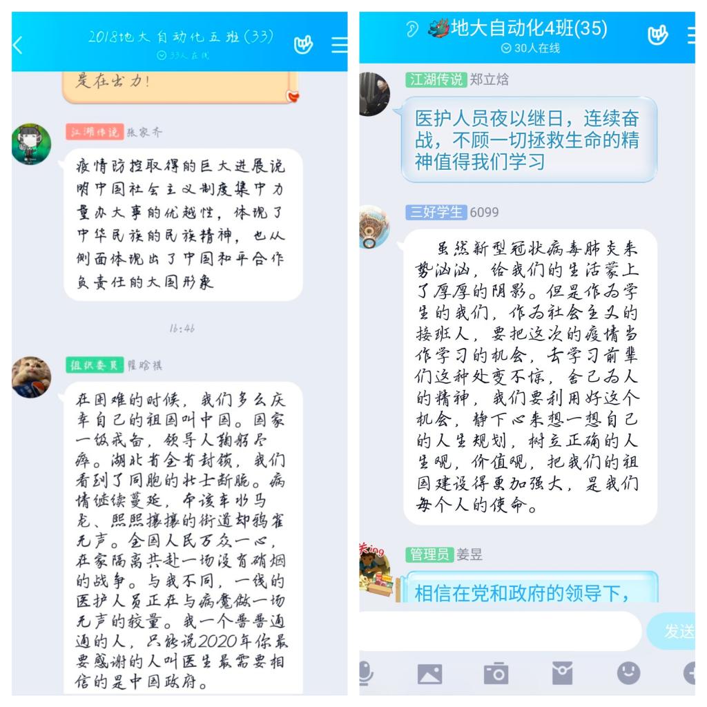 自动化专业共青团员陈文 疫情就是命令,防控就是责任。在这场众志成城、同仇敌忾的战斗中,中国人民的团结信念和责任感令世界印象深刻。多难兴邦,中华民族数千年的文明史上,经历过多次灾害,但是灾害是压不垮伟大的中华人民的,在以习近平同志为核心的党中央正确的领导下,英雄的中华人民一定会夺取最终的胜利。经过一堂思政课的教导,我明白了许多。士不可以不弘毅,任重而道远,少年强则国强,少年独立则国独立。君可见,此次疫情当中,已有无数同辈前去战疫一线,学着先辈的模样,挡下死神前进的步伐。爱国,就是最大的责任担当,文明的薪火相传,要看我们每一代人承担起责任与担当。苟利国家生死以,岂因祸福避趋之!我辈中华人民即将担任起为实现中华民族伟大复兴而努力的重任。这不仅仅是一堂课,更是对我们人生的引领。