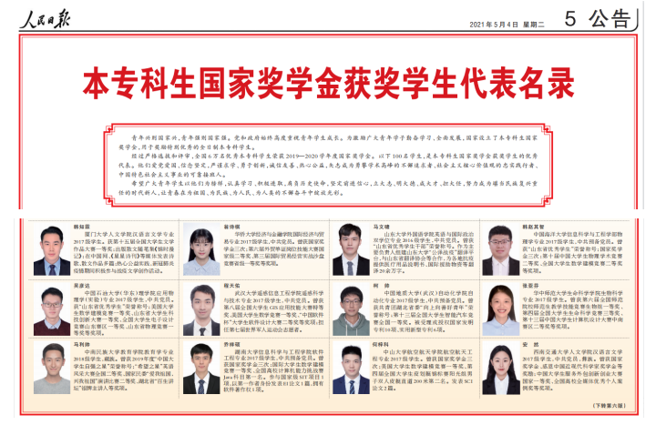 5月4日,人民日报刊发了2019-2020学年度本专科生国家奖学金获奖学生代表名录。经过严格选拔和评审,全国6万名优秀本专科学生荣获2019-2020学年度国家奖学金,100名学生入选本专科生国家奖学金获奖学生代表名录。91探花