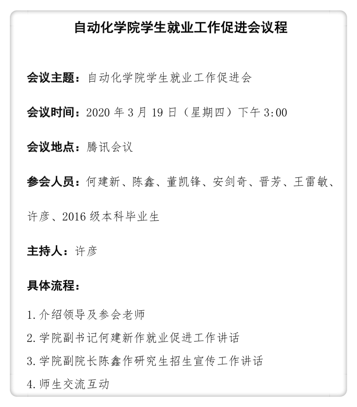 召开2020届毕业生就业工作促进会,学院党委副书记何建新、副院长陈鑫、各系主任和教师、2016级毕业生等共94名师生参加,会议由毕业生辅导员许彦主持。