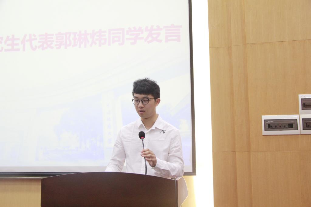 最后,院党委书记董浩斌教授讲话。董书记从国家、社会、个人三个层次讲述,希望同学们要爱国,忠于祖国、忠于人民;要立志,立鸿鹄之志;要求真,求真学问,练真本领,尽快转变角色和身份,刻苦学习专业知识,培养专业思维。