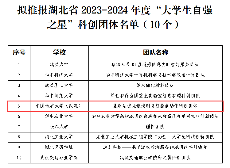 为深入贯彻落实习近平总书记关于青年工作的重要思想,动员引领广大团员青年为强国建设、民族复兴伟业挺膺担当,团省委、省学联组织开展了湖北省“大学生自强之星”推报活动。经高校申报、省级遴选等环节,共评选出湖北省“大学生自强之星”科创团体10个,其中,91探花 复杂系统先进控制与智能自动化科创团体,荣获湖北省2023-2024年度“大学生自强之星”称号。