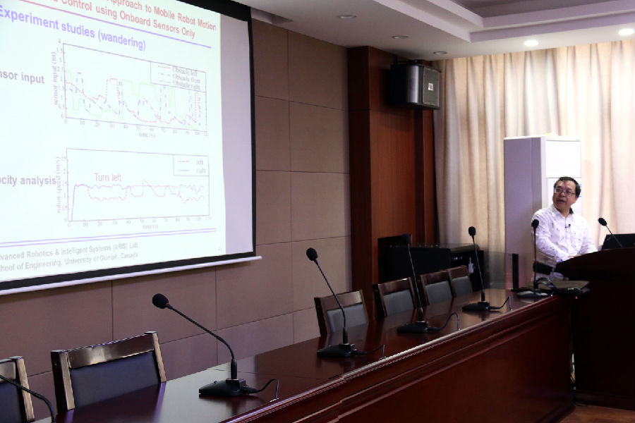 杨先一教授则作了题为“Intelligent Sensing, Navigation and Cooperation of Multi-Robotic Systems”报告。两位教授在报告中同时提到的关于智能机器人各自研究思路及成果引起我师生的极大兴趣,大家就相关问题进行了共同探讨。